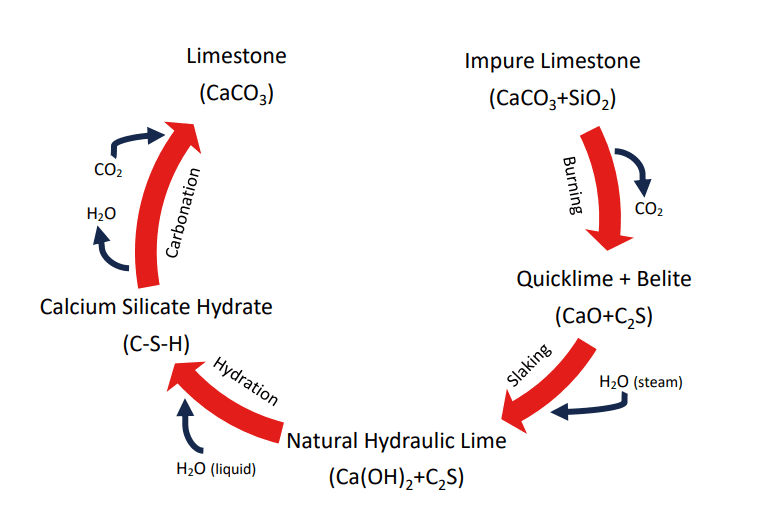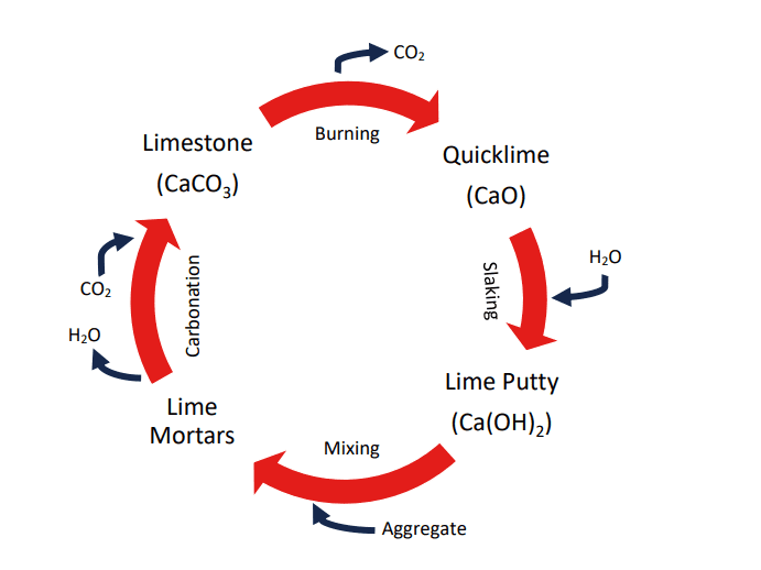 Lime is divided into two categories as hydraulic and non-hydraulic lime. Non-hydraulic lime becomes a building material by burning limestone (calcium carbonate) in a kiln to obtain quick lime (calcium oxide), then it is slaked with water to get lime putty and thus acts as a binder. Lime putty is mixed with aggregates and carbonated with the help of air, resulting in a hardened form similar to limestone.