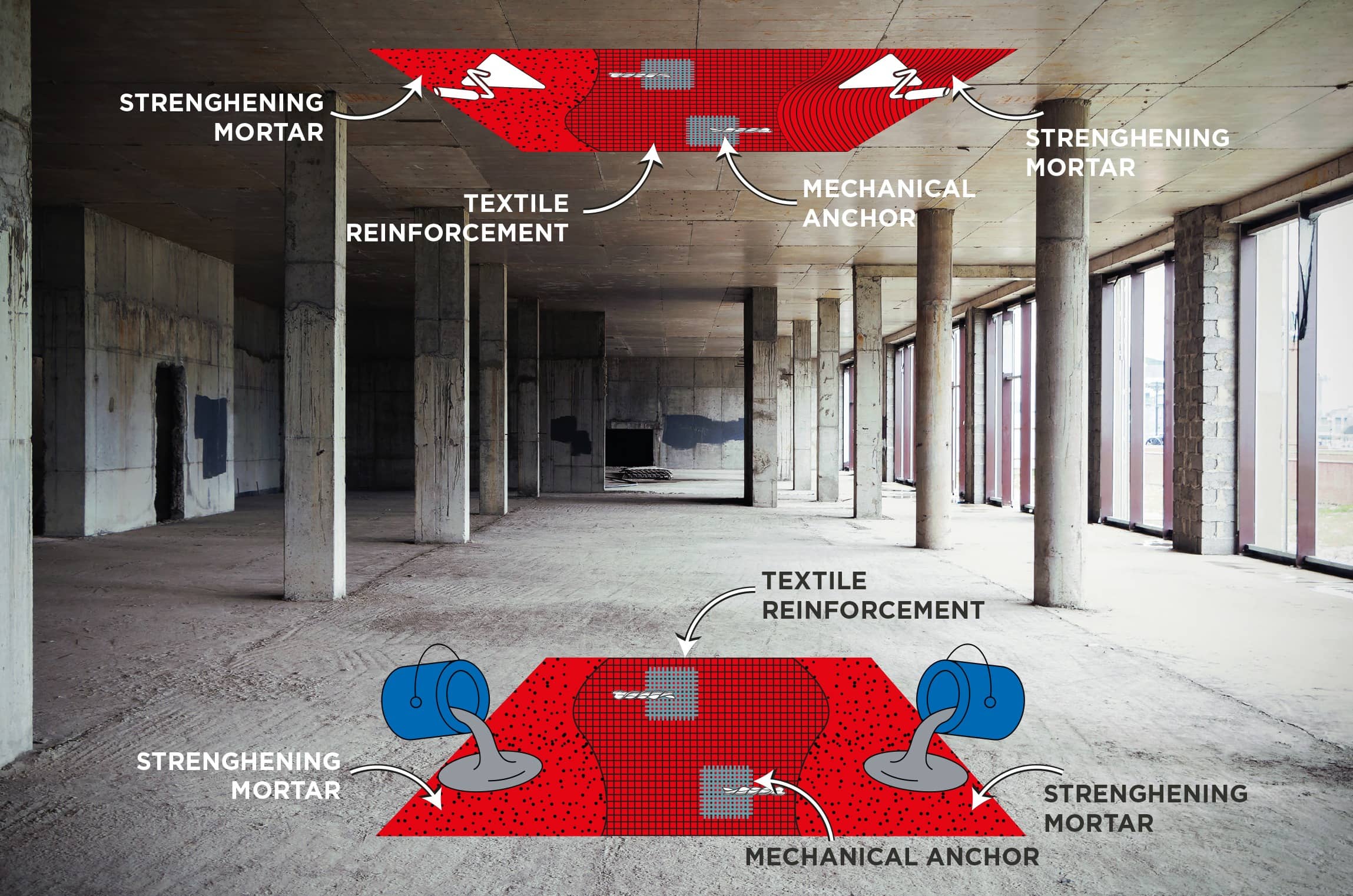 In addition to the traditional FRP method for strengthening RC slabs, FRCM system is globally recognized and widely used. FRCM strengthening system’s name comes from the initials of Fabric-Reinforced Cementitious Matrix, which is a modern and up-to-date method of repair and strengthening. In its simplest form, the strengthening matrix consists of textile reinforcement (also called strengthening textile or technical textile) and a cement or lime-based mortar.